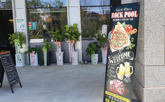 음식점이 개업을 해서 화분이 많이 놓여 있다.